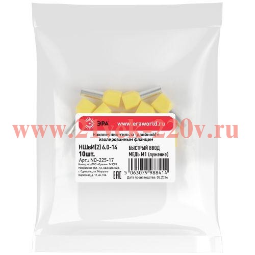 Наконечник-гильза ЭРА NO-225-17 двойной НШвИ(2) 6.0-14 с изолированным фланцем упаковка 10 шт