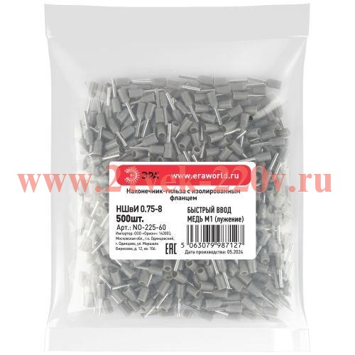 Наконечник-гильза ЭРА NO-225-60 НШвИ 0.75-8 с изолированным фланцем упаковка 500 шт