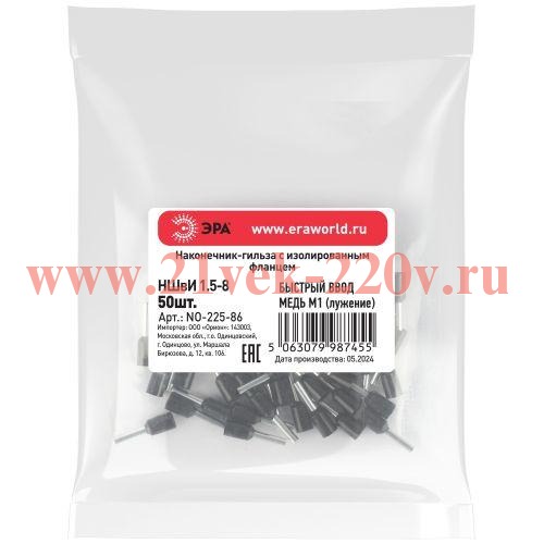 Наконечник-гильза ЭРА NO-225-86 НШвИ 1.5-8 с изолированным фланцем упаковка 50 шт