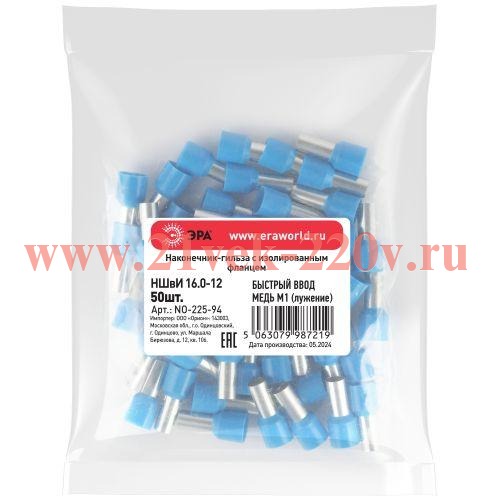 Наконечник-гильза ЭРА NO-225-94 НШвИ 16.0-12 с изолированным фланцем упаковка 50 шт