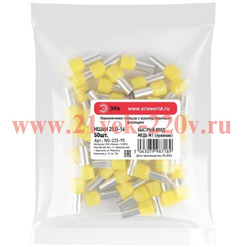 Наконечник-гильза ЭРА NO-225-95 НШвИ 25.0-16 с изолированным фланцем упаковка 50 шт