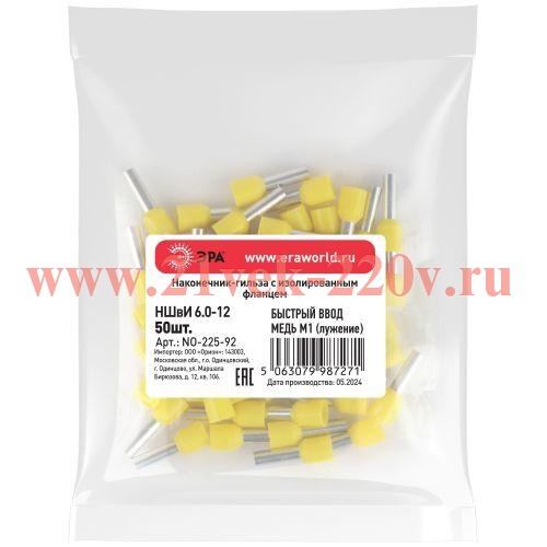 Наконечник-гильза ЭРА NO-225-92 НШвИ 6.0-12 с изолированным фланцем упаковка 50 шт