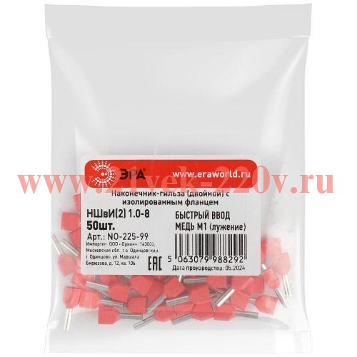 Наконечник-гильза ЭРА NO-225-99 двойной НШвИ(2) 1.0-8 с изолированным фланцем упаковка 50 шт