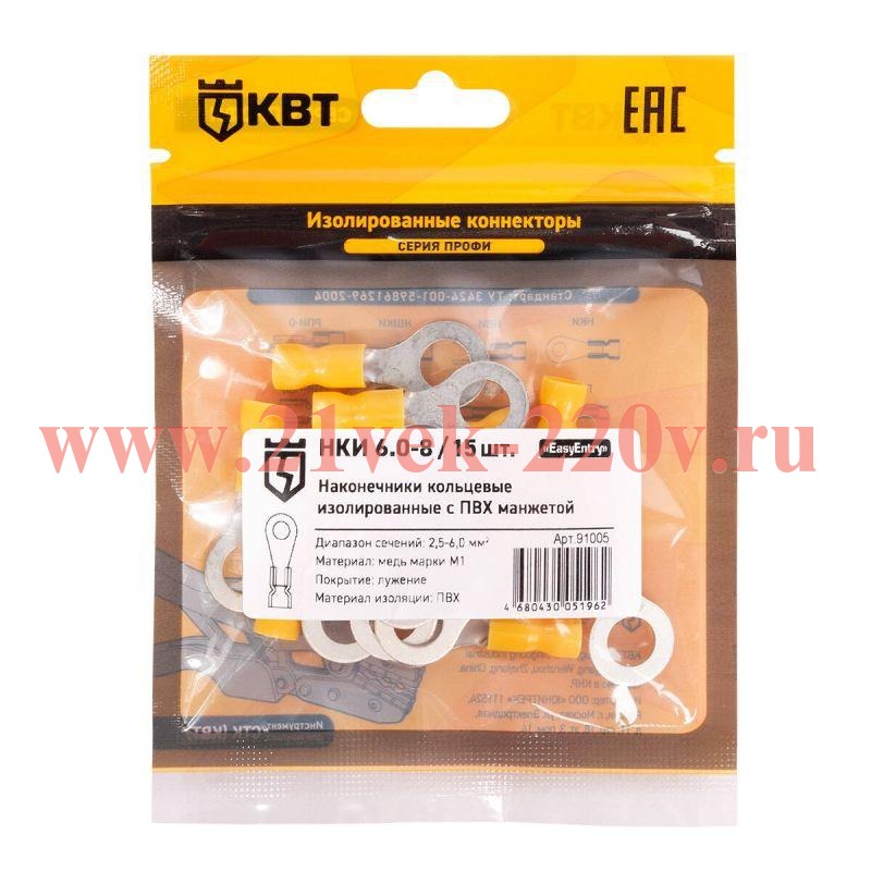 Наконечник кабельный кольцевой изолированный НКИ 6.0–8 (уп.15шт) КВТ