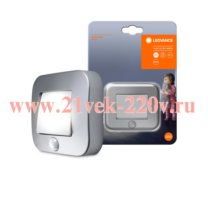 Серебрянный автономный, накладной, регулируемый светодиодный ночник Ледванс с датчиком движения и освещености, холодного белого света.