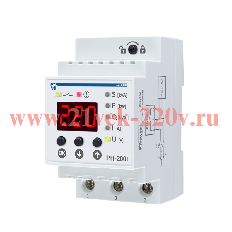 - РН-260t измеряет и выводит на дисплей потребляемый нагрузкой ток, активную и реактивную мощность и отключает нагрузку при превышении заданных порогов по току и мощности.