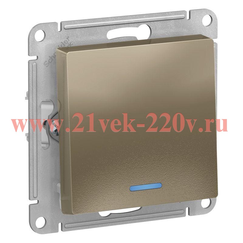 Механизм SE AtlasDesign (цвет шампань) выключателя 1-клавишного с подсветкой подходит для сетей 250 В, на ток 10 А.- Благодаря светодиодной подсветке синего цвета изделие легко найти в темноте.- Лицевые детали из качественного ABS-пластика, устойчивого к царапинам и УФ-излучению.- Усиленные прямые монтажные лапки для лучшей фиксации механизма в монтажной коробке.