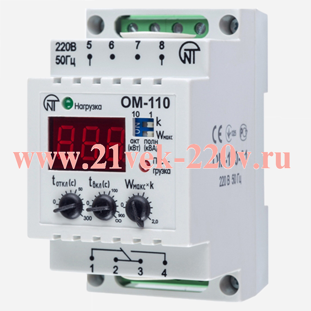 Реле ограничения мощности ОМ-110 предназначено для постоянного контроля активной или полной мощности однофазной нагрузки. Измеряемый диапазон активной или полной мощности однофазной нагрузки. Измеряемый диапазон от 0 до 20 кВт или от 0 до 20 кВА. OM-110 выполняет отключени нагрузки в случае превышения заданной пользователем максимально допустимой мощности потребления нагрузки с заданным временем отключения и последующим автоматическим включением с заданным временем включения или блокировкой повторного включения. Уставки мощности, время срабатывания реле и время автоматического повторного включения (АВП) устанавливает пользователь с помощью потенциометров и dip-переключателей, вынесенных на лицевую панель прибора.