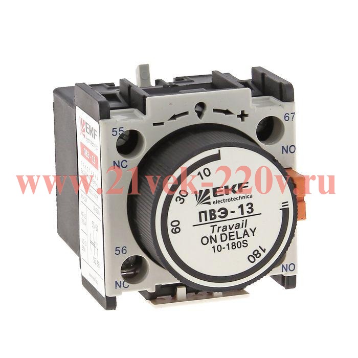 Позволяют получить задержку замыкания или размыкания вспомогательной цепи от 0,1 до 180 с. Приставка имеет один нормально разомкнутый (NO) и один нормально замкнутый (NC) контакт. Контактная приставка механически соединяется с контакторами и фиксируется при помощи защёлки. Способ крепления обеспечивает жёсткую и надёжную связь между контактной приставкой и контактором. Приставки выдержки времени ПВЭ применяются в качестве комплектующих изделий в схемах управления, в том числе, электроприводами, совместно с контакторами серии КМЭ EKF PROxima, для получения задержки включения или отключения контактора.