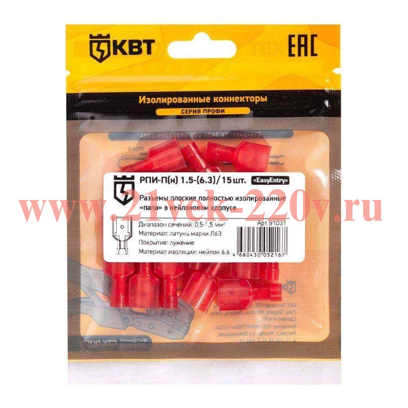 Разъем плоский изолированный папа РПИ-П(н) 1.5-(6.3) (уп.15шт) КВТ