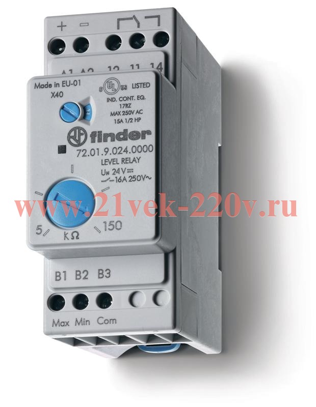 Реле контроля уровня настраиваемый диапазон чувствительности 5…150кОм 240В AC выход 1CO 16А модульно