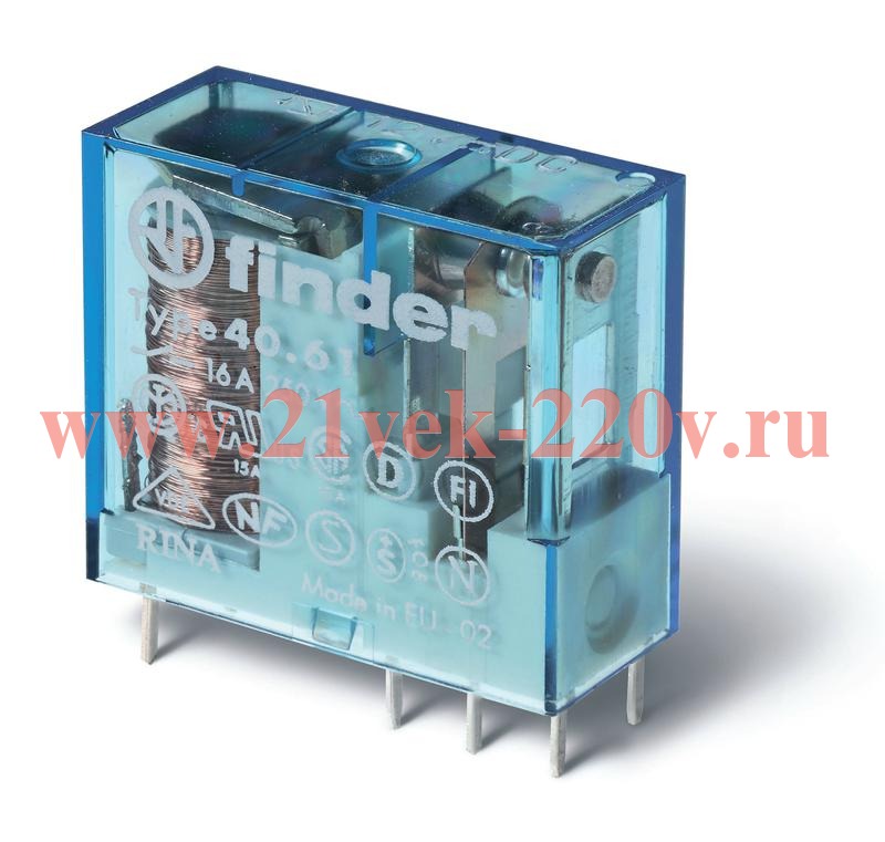 Данная версия промежуточного реле от известной компании Finder относится к 40 серии миниатюрных элементов управления и представляет собой силовое реле для прямого монтажа на печатную плату или через розетки 95 серии. Оно обладает 1 перекидным контактом из сплава серебра и оксида кадмия AgCdO, который обладает высокой износостойкостью и устойчив к расплавлению. Универсальная модель реле оснащена катушкой постоянного тока с максимальной подачей напряжения 24 Вольта. Предельная нагрузка током составляет 16 Ампер при допустимом рабочем напряжении сети 250 Вольт. Миниатюрный модуль имеет выводы с шагом 5 мм и обладает следующими габаритными параметрами: 29х25х12,4 мм. Корпус изоляции изготовлен из прочного пластика голубого цвета и соответствует нормам по пожаростойкости и выделению токсичных веществ. Электромеханическое реле предназначено для коммутации электрических цепей в схемах управления и служит для сигнализации и автоматизации. Оно широко используется в различных отраслях промышленности, медицинском оборудовании, электрораспределительных щитах, торговых и игровых автоматах.