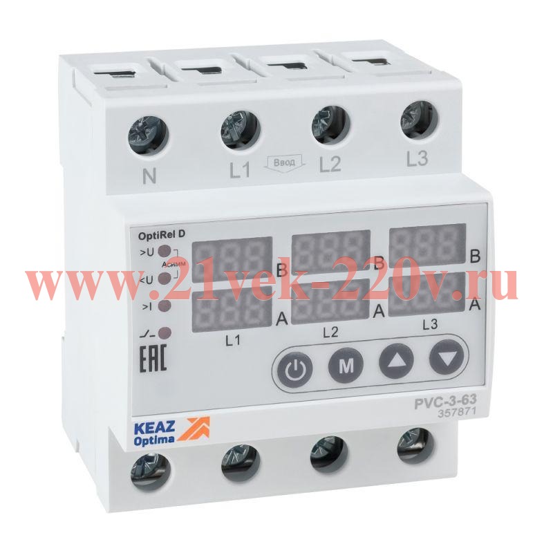 Реле напряжения OptiRel D PVC-3-63 с ЖК-дисплеем и контролем тока 3Ф 63 А КЭАЗ