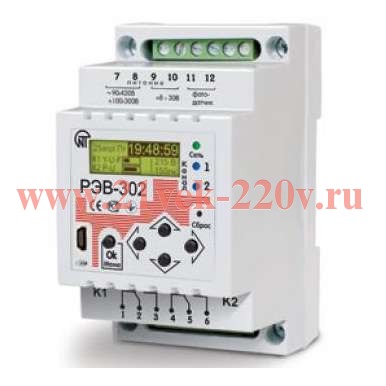Многофункциональное реле РЭВ-302 представляет собой микропроцессорное программируемое устройство и предназначено для включения/отключения одной или двух нагрузок, в предварительно установленные пользователем моменты времени, с учетом сетевого напряжения и освещнности внешнего фотодатчика.