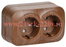 Розетка электрическая двойная с заземляющими контактами и защитными шторками, накладного монтажа Глори ИЭК цвета дуб ERH24-K24-16