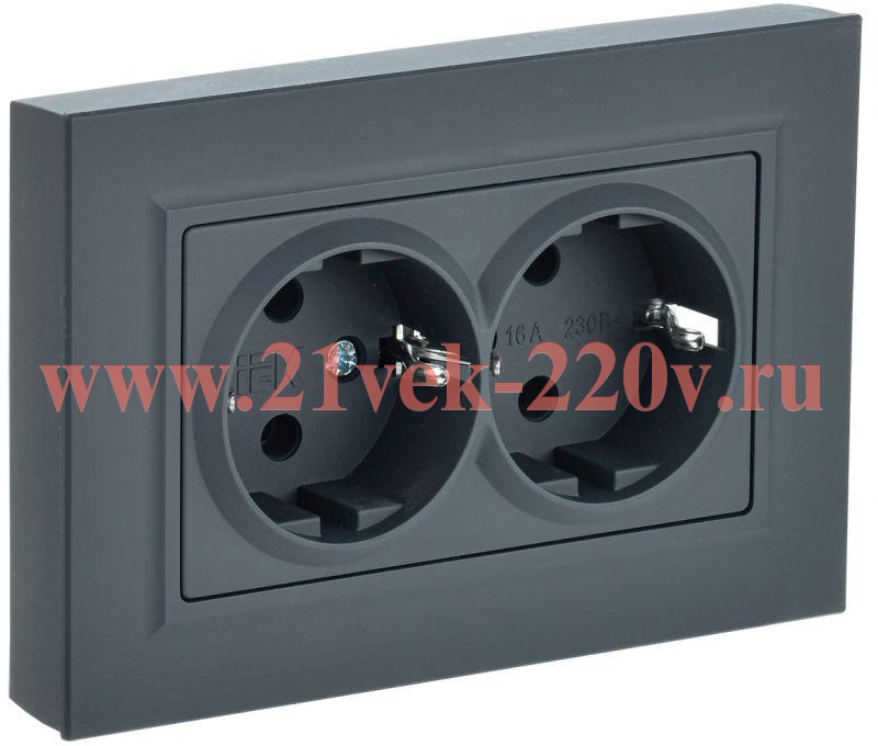 Двухместная электрическая розетка немецкого стандарта графитового цвета с защитными шторками, скрытого монтажа в одну монтажную коробку, IEK BRITE. BR-R24-16-K53-F