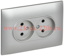 Двухместная электрическая розетка без заземляющих контактов с защитными шторками, винтовые зажимы скрытого монтажа цвета серебро