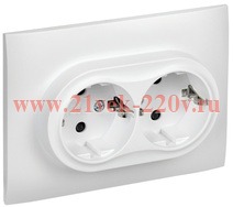 Двухместная электрическая розетка с заземляющими контактами с защитными шторками, винтовые зажимы скрытого монтажа цвет белый