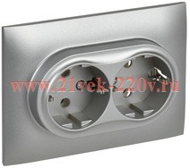 Двухместная электрическая розетка с заземляющими контактами, винтовые зажимы скрытого монтажа цвета серебро