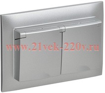 Двухместная электрическая розетка с заземляющими контактами, защитными шторками и крышкой, винтовые зажимы скрытого монтажа цвета серебро