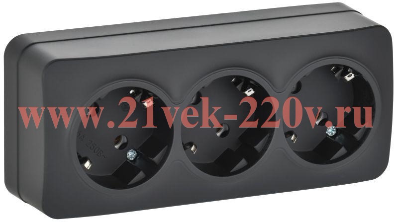 Электрическая розетка тройная с заземляющими контактами, накладного монтажа Глори ИЭК матового черного цвета ERH31-K02M-16