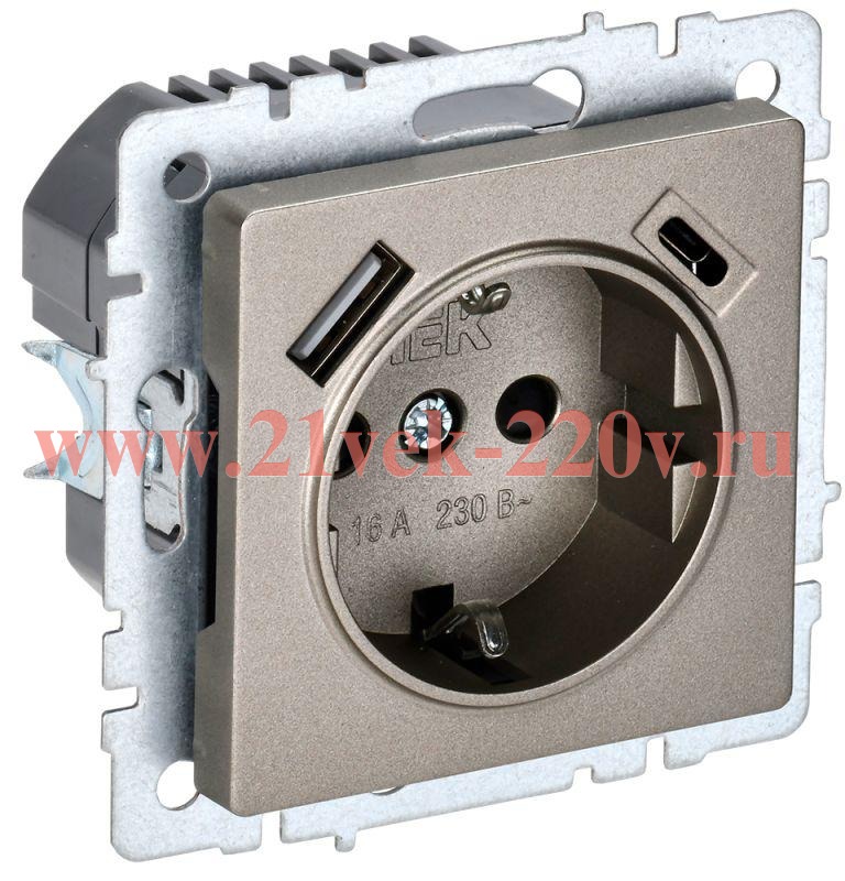 Розетка BRITE РЮш11-1-БрШ 16А с USB A+C 18Вт с заземл. защ. шторки шампань IEK BR-R14-16-U22-018-K37