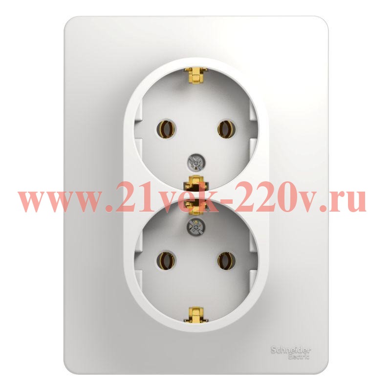 Розетка двойная SE Glossa (в сборе, цвет белый) с заземлением, без шторок подходит для сетей 250 В, на ток 16 А.- Заземляющий контакт обеспечивает дополнительную защиту от удара электрическим током. При наличии заземления электрический потенциал уходит в землю, защищая человека.- Выполнен из материала PС+ASA, стойкого к УФ-излучению и появлению царапин.- Двойная розетка позволяет подключить два устройства в одном месте.