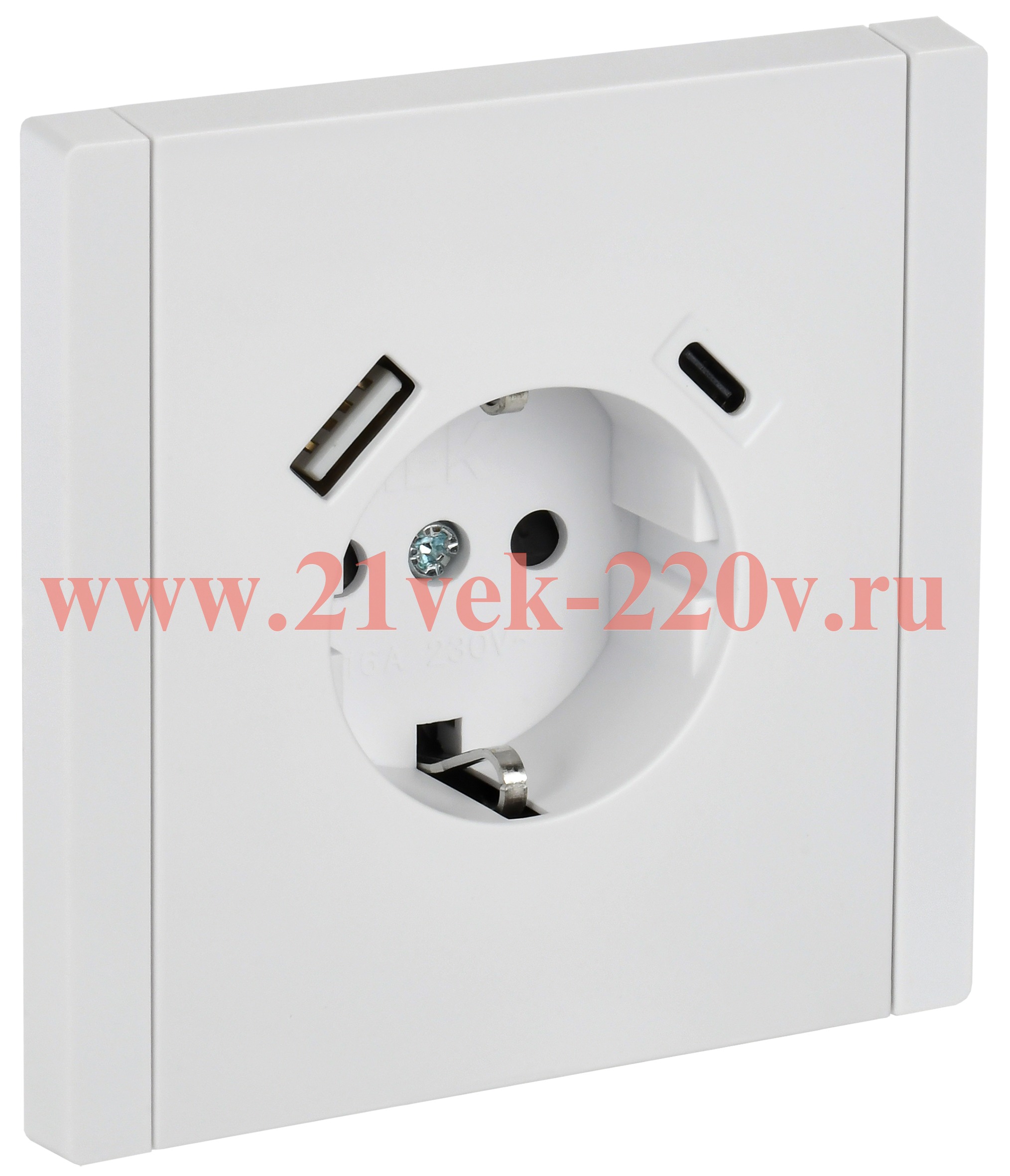 Одноместная электрическая розетка с заземлением и разъемами USB тип-A+С скрытого монтажа белого цвета FP-R14-16-U22-018-K01
