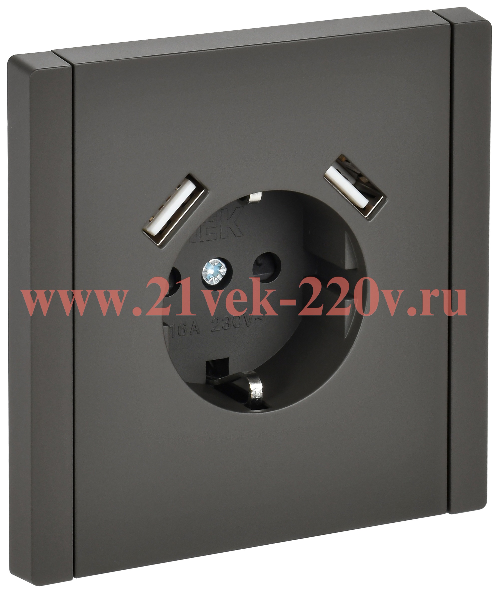 Одноместная электрическая розетка с заземлением и разъемами USB тип-A скрытого монтажа серого цвета FP-R14-16-U21-D31-K03