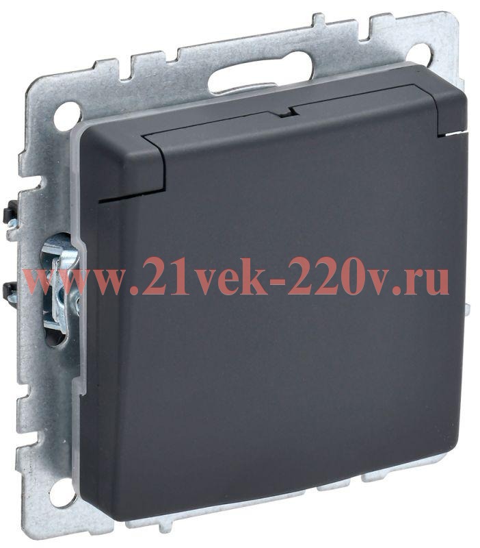 Механизм электрической розетки немецкого стандарта с повышенной защитой от пыли и влаги с защитными шторками и крышкой, лицевая панель графитового цвета для скрытого монтажа, IEK BRITE. BR-R16-16-44-K53