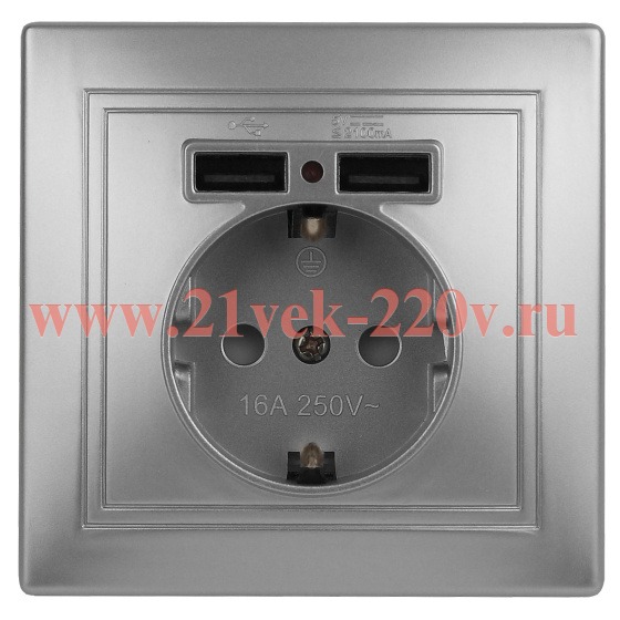 Розетка Intro Plano 1-410-03 с заземлением 2P+E Schuko со шторками 16А-250В + 2хUSB 5В-2 1А IP20 СУ алюминий