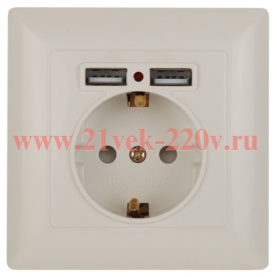 Розетка Intro Solo 4-410-02 с заземлением P+E Schuko со шторками 16А-250В + 2хUSB IP20 СУ слоновая кость