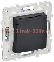 Одноместная электрическая розетка с защитными шторками, заземляющими контактами и крышкой, винтовые зажимы скрытого монтажа цвета графит