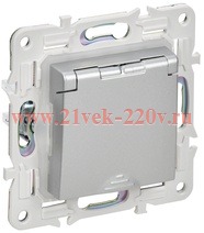 Одноместная электрическая розетка с защитными шторками, заземляющими контактами и крышкой, винтовые зажимы скрытого монтажа цвета серебро