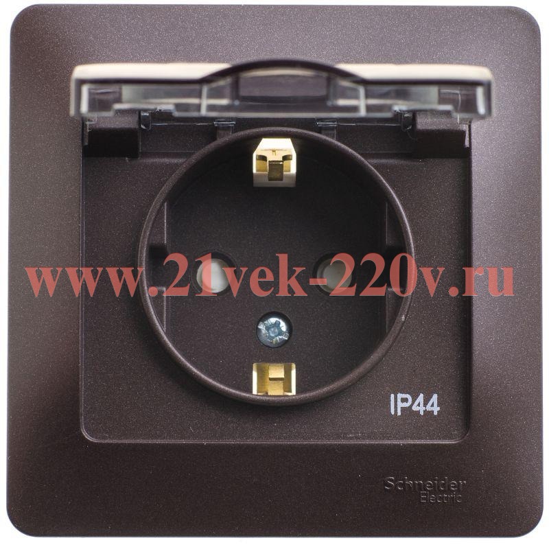 Розетка с контактом заземления шоколад, со шторками, с крышкой 16A IP44 Schneider Electric Glossa