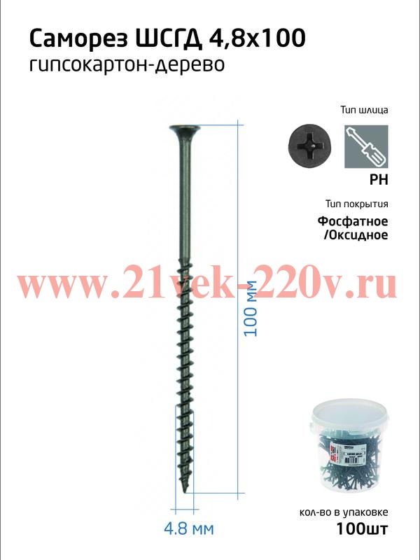 Саморез 4.8х100 гипсокартон-дерево (уп.100шт) ведро Tech-Krep