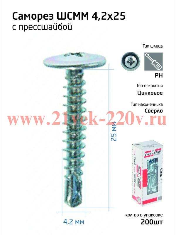 Саморез для тонкого метал. листа со сверлом 4.2х25 (уп.200шт) коробка Tech-Krep