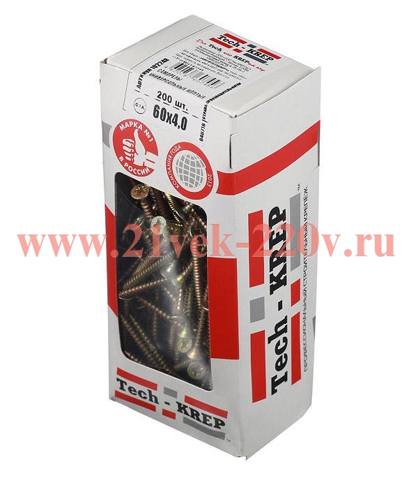 Универсальный саморез Tech-Krep 60х4,0 мм 200 шт желтый, коробка с окном, изготовлен из углеродистой стали с цинковым покрытием, имеет потайную головку с крестообразным шлицем PZ, крупную накатанную резьбу и острый наконечник.