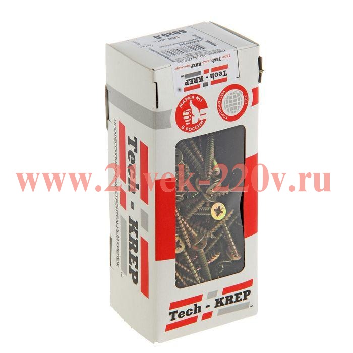 Универсальный саморез Tech-Krep 60х5,0 мм 100 шт желтый, коробка с окном, изготовлен из углеродистой стали с цинковым покрытием, имеет потайную головку с крестообразным шлицем PZ, крупную накатанную резьбу и острый наконечник.