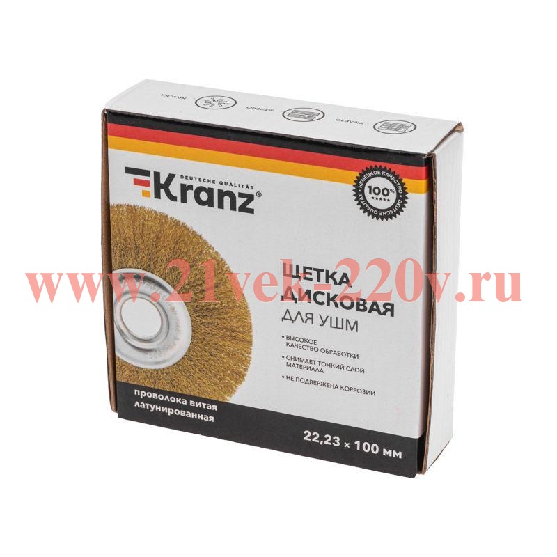 Щетка дисковая для УШМ витая латунированная проволока 100мм отв. 22.23мм Kranz KR-91-1241
