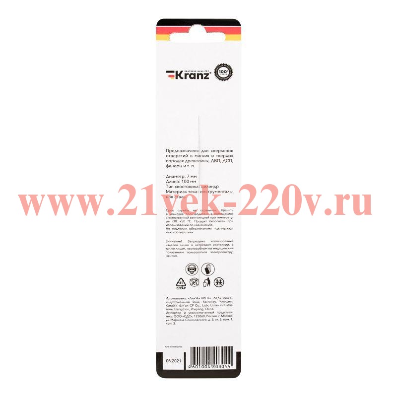 Сверло KRANZ предназначено для сверления отверстий в мягких и твердых породах древесины, ДВП, ДСП, фанеры и т. п.
