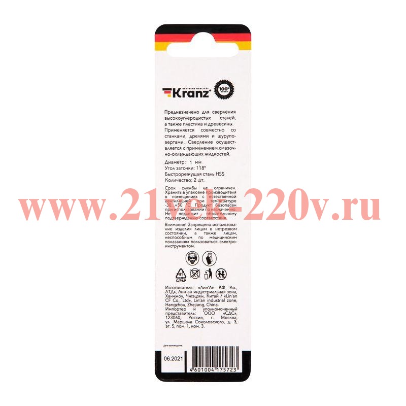 Сверло по металлу 1.0мм HSS DIN 338 (уп.2шт) Kranz KR-91-0551