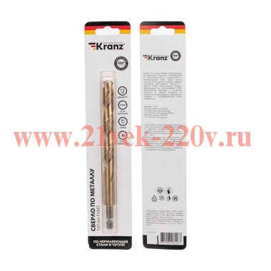 Сверло по металлу, 12мм, Р6М5, ТИТАН, шестигранный хвостовик (1 шт. в упаковке) DIN 338 KRANZ Сверло по металлу KRANZ предназначено для сверления отверстий в нержавеющей и жаростойкой стали, легированной и нелегированной стали, сером чугуне, стальном литье, цветных металлах и твердой пластмассе. Используется совместно с дрелью. Изделие выполнено из качественной быстрорежущей стали Р6М5, что обеспечивает долгий ресурс работы, высокую производительность, устойчивость к перегреву и высоким нагрузкам. Сверло обладает пониженным коэффициентом трения и обеспечивает эффективный отвод стружки. Рабочая часть инструмента позволяет быстро и надежно сверлить металл, гарантирует ровные и аккуратные отверстия. Заточка режущей части под углом 135 градусов способствует эффективному входу в материал. Покрытие из нитрид-титана предотвращает образование коррозии и преждевременный износ инструмента. Шестигранный хвостовик исключает проворачивание в зажимных патронах. Ресурс использования заметно увеличивается при использовании СОЖ.