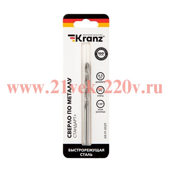 Сверло по металлу 4.5х80х47мм "Стандарт+" (P6M5 M-2) DIN 338 блист. Kranz KR-91-0529