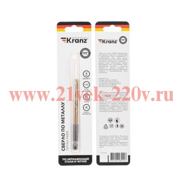 Сверло по металлу 4мм Р6М5 ТИТАН шестигранный хвостовик DIN 338 Kranz KR-91-5503