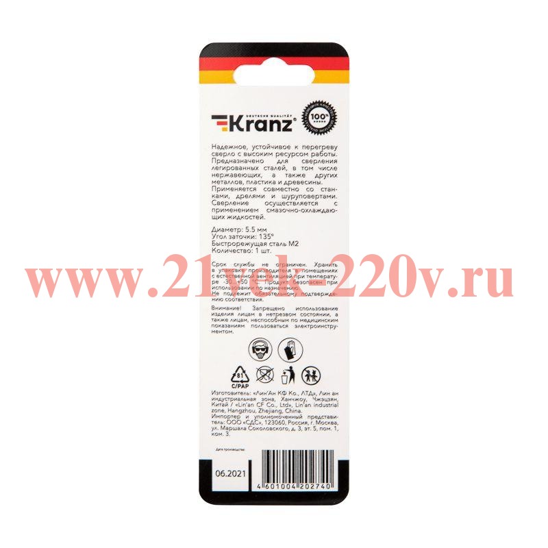 Сверло по металлу 5.5х93х57мм "Стандарт+" (P6M5 M-2) DIN 338 блист. Kranz KR-91-0531