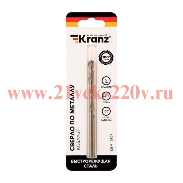 Сверло по металлу 5мм "Кобальт" (сталь HSS-Co 5% M35 P6M5K5) DIN 338 (блист.1шт) Kranz KR-91-0507