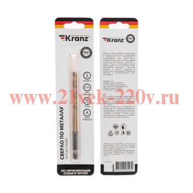 Сверло по металлу, 5мм, Р6М5, ТИТАН, шестигранный хвостовик (1 шт. в упаковке) DIN 338 KRANZ Сверло по металлу KRANZ предназначено для сверления отверстий в нержавеющей и жаростойкой стали, легированной и нелегированной стали, сером чугуне, стальном литье, цветных металлах и твердой пластмассе. Используется совместно с дрелью. Изделие выполнено из качественной быстрорежущей стали Р6М5, что обеспечивает долгий ресурс работы, высокую производительность, устойчивость к перегреву и высоким нагрузкам. Сверло обладает пониженным коэффициентом трения и обеспечивает эффективный отвод стружки. Рабочая часть инструмента позволяет быстро и надежно сверлить металл, гарантирует ровные и аккуратные отверстия. Заточка режущей части под углом 135 градусов способствует эффективному входу в материал. Покрытие из нитрид-титана предотвращает образование коррозии и преждевременный износ инструмента. Шестигранный хвостовик исключает проворачивание в зажимных патронах. Ресурс использования заметно увеличивается при использовании СОЖ.
