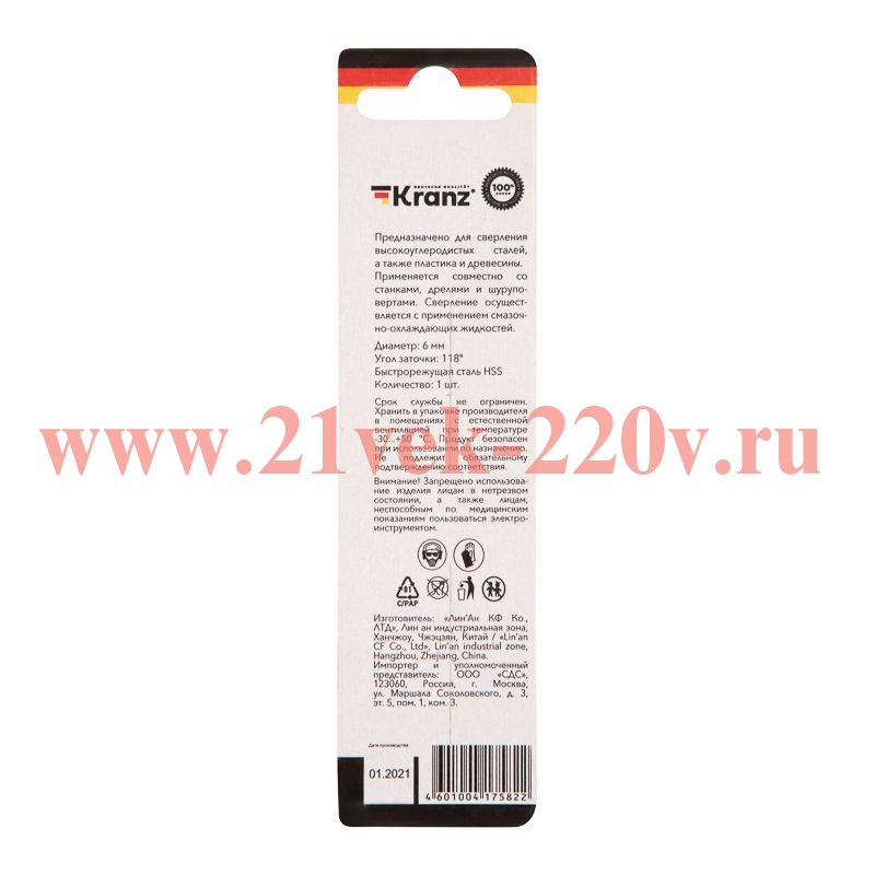 Сверло KRANZ изготовлено по стандарту DIN 338 и используется для сверления отверстий в таких материалах, как сталь, дерево и пластик. Применяется с дрелями, шуруповертами и станками с цилиндрическим типом крепления. Продукт изготовлен из быстрорежущей стали HSS, благодаря чему отличается высокой производительностью и долгим сроком эксплуатации. Конструкция с прокатным типом спирали сохраняет точное положение оснастки во время сверления, что гарантирует ровные и аккуратные отверстия без сколов и трещин. Заточка режущей части под углом 118 градусов обеспечивает эффективный вход в материал, уменьшая износ сверла.