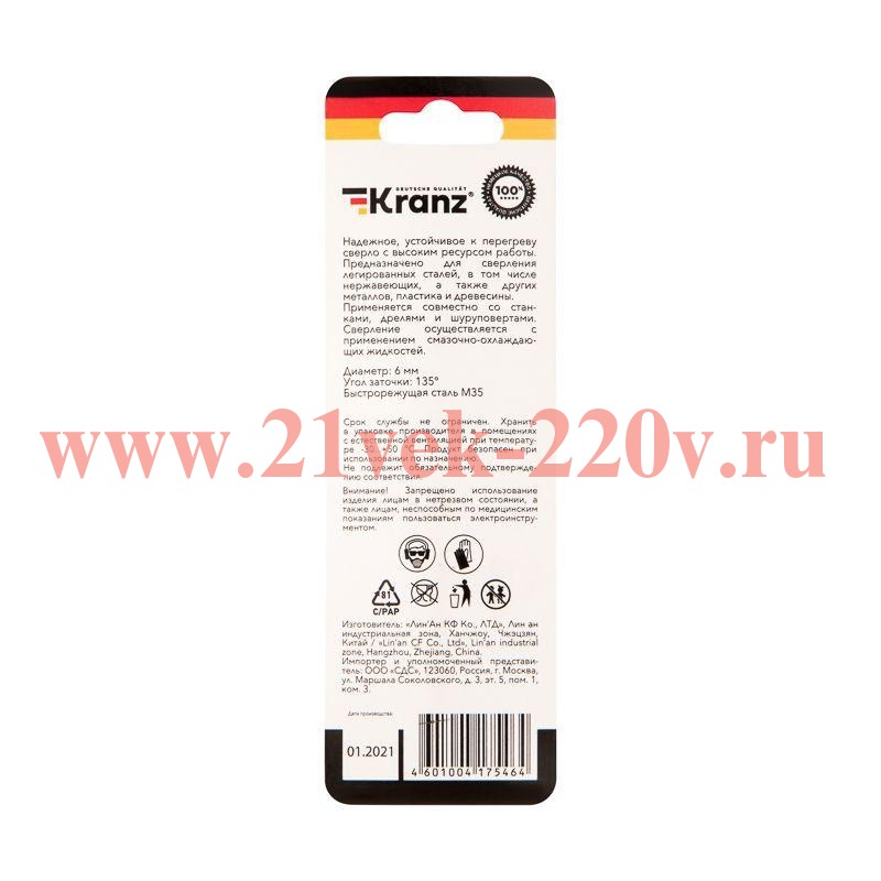 Сверло по металлу KRANZ изготовлено по стандарту DIN 338 и используется для сверления отверстий в таких материалах, как сталь, чугун, нержавеющая сталь, легированные и цветные металлы. Имеет цилиндрический хвостовик, применяется совместно с дрелями, шуруповертами и станками.